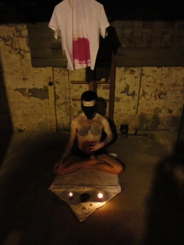 In this performance, attention was brought to the energy of the sleeping giant in the belly. The giant within was doused in the blood of a beet and aroused by the humming of lips so that it might wake up, get up, and begin to exercise its strength.